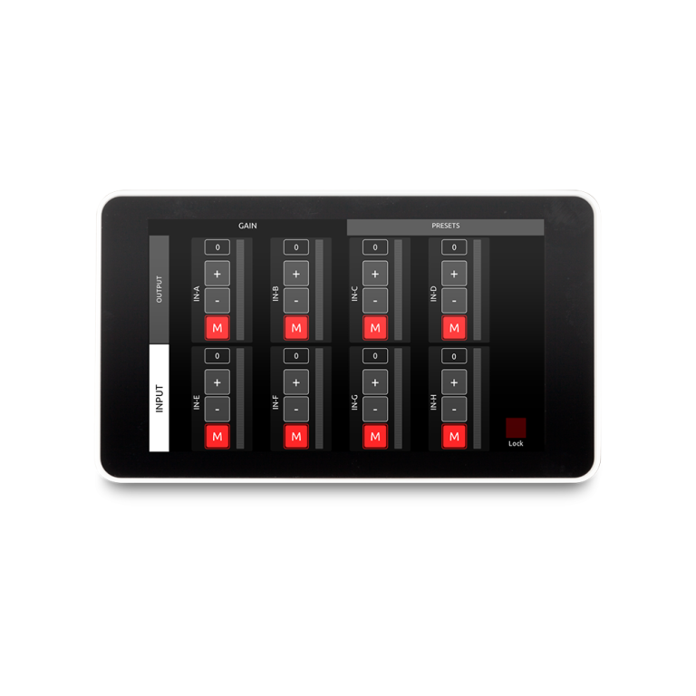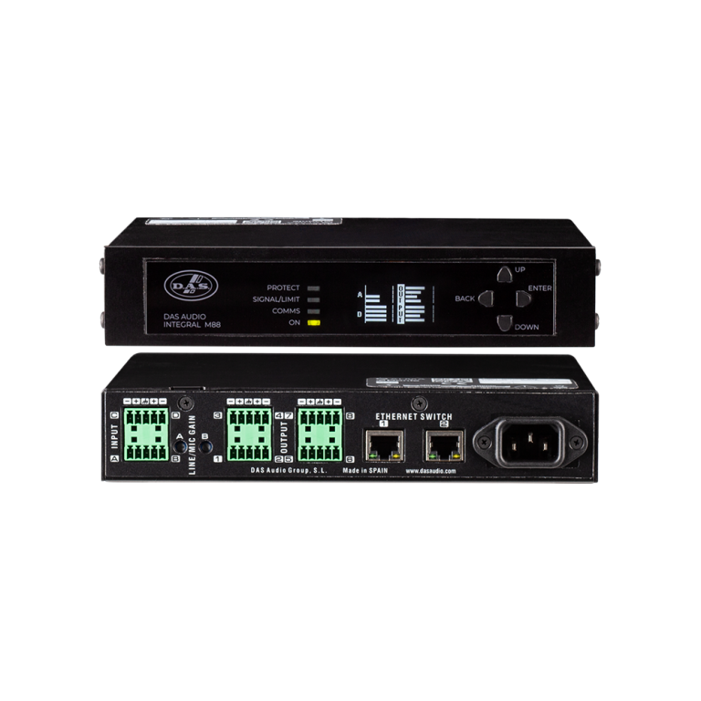 Mátrixos audioerősítő (4 csatorna), 4 bemenet x 8 kimenet (analóg audio) + 4×4 I/O DANTE csatorna, 1600 W, kimenetenként két prioritási szint, ALMA vezérlés