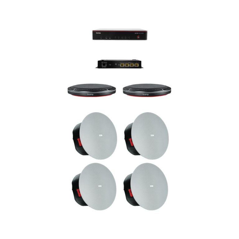 Közepes méretű tárgyalótermekhez tervezett csomag, TesiraFORTÉ X 400 DSP-vel és fehér mennyezeti mikrofonnal.
