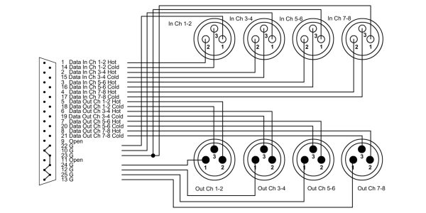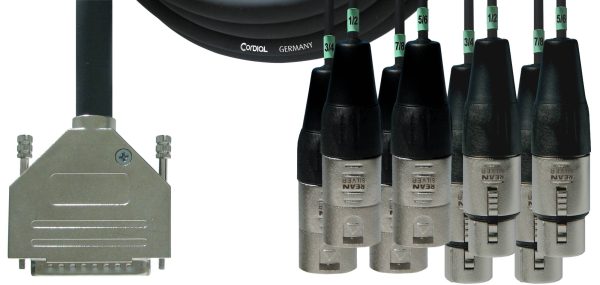 Our CFD DFMY is a professional digital multicore cable (AES/EBU) for LIVE and studio use. The pin configuration complies with the YAMAHA dsub25 specification, i.e. D-Sub 25 pin connector male to 4 XLR male/4 XLR female. The XLR connectors have a 3-pin configuration and a nickel-plated metal housing. The corresponding bulk cable is the CMD 8, which transmits analog as well as DMX signals excellently and features a spiral wound tinned copper pair screen and an additional tinned overall shield.