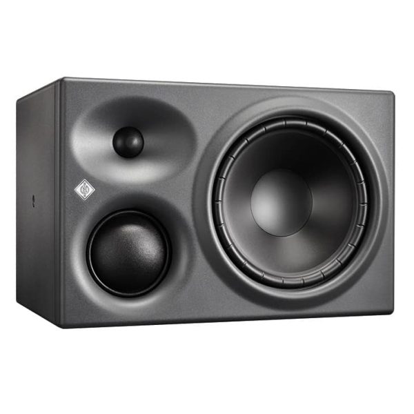 The KH 310 is a three-way tri-amplified monitor with thermally protected Class AB amplifiers (210 W and two times 90 W). Its Mathematically Modeled Dispersion™ (MMD™) waveguide delivers sound waves into the room with superior accuracy. The drivers are modeled using Neumann’s in-house developed software, which reduces non-linear distortion in every situation. Sound distributed in a horizontally precise manner ensures flexibility in the listening position; the narrower vertical dispersion reduces the negative effects of nearby reflections, for example from a desk or mixing console. The precisely controlled dispersion characteristics optimize reproduction in different room configurations and the response is extremely adaptable through various acoustical control settings.